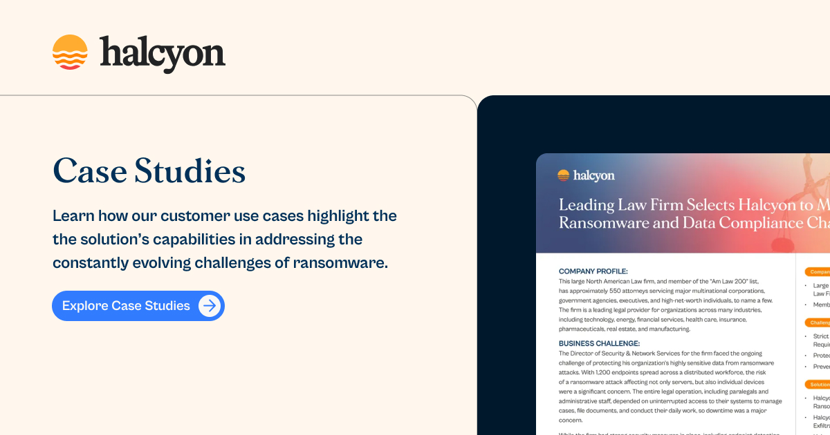 Halcyon, the leading anti-ransomware solution provider, is purpose-built to defeat ransomware attacks. Our technology takes an end-to-end approach to proactively disrupt threats at every stage of the attack lifecycle, from pre-execution to data exfiltration and encryption. With a 24/7 expert team that does the heavy lifting for you, and a robust ransomware warranty, Halcyon eliminates the need for ransom payments, ensures operational continuity, and protects businesses from data extortion.