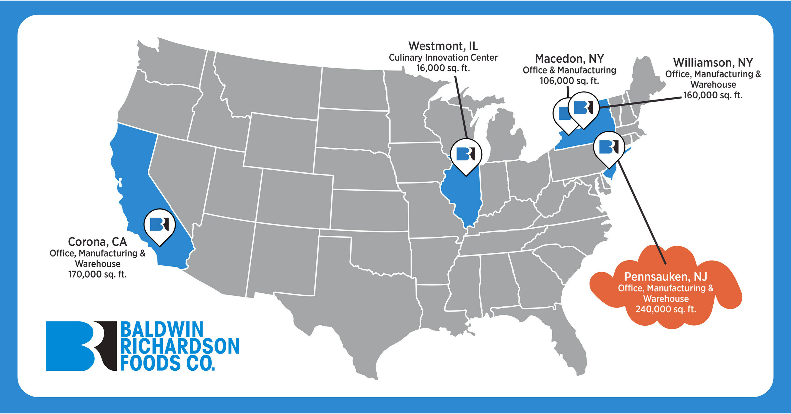 BALDWIN RICHARDSON FOODS (BRF) is a leading custom ingredients manufacturer for the food and beverage industry. We combine our formulation expertise and unique packaging options with robust processing capabilities to supply high quality ingredient solutions for our customers within the consumer packaged goods and foodservice channels. Additionally, we manufacture finished goods for the private label sector as well as having our own retail brands, Mrs. Richardson’s dessert sauces and Nance’s mustards/condiments.Our formulation strengths include controlled water activity fillings, dessert sauces and fruit preparations as well as beverage syrups and savory sauces. And, with our state-of-the-art Innovation & Culinary Center focused on innovation to our award-winning commercialization process, we truly are a full development partner. We are headquartered in Macedon, NY and our Innovation & Culinary Center is in Westmont, IL. Our manufacturing facilities are located in Corona, CA, Pennsauken, NJ, Macedon, NY, and Williamson, NY.
